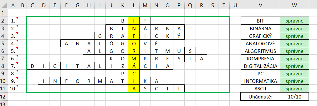 V oblasti V2:V11 pomocou vhodného vzorca zobrazíme slovo, ktoré vpísal užívateľ do tajničky v danom riadku. Použiť môžeme funkciu CONCATENATE, prípadne od verzie 2019 aj funkciu CONCAT alebo symbol &. Aby sme mohli tajničku využívať aj s obmenami slov, pri vypisovaní slova budeme počítať so všetkými stĺpcami tajničky, teda v prípade prvého vzorca od bunky C2 až po bunku T2.