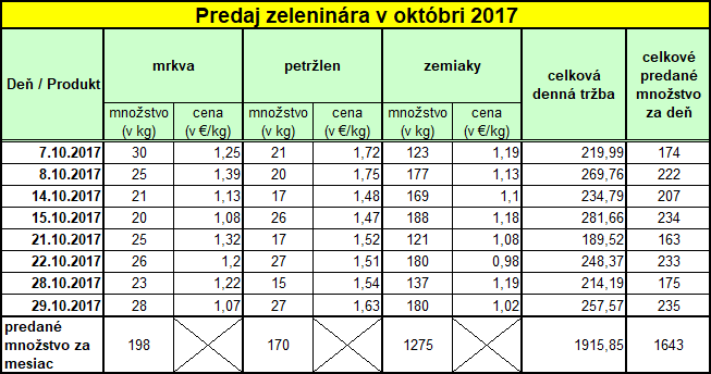 - Tabuľku v hárku Zeleninár naformátujte podľa vzoru na obrázku. Nezabudnite na použitie zlučovania buniek a zalomenie textu. Použite písmo Arial veľkosť 14 a 10, farby a rozmery riadkov a stĺpcov odhadnite.